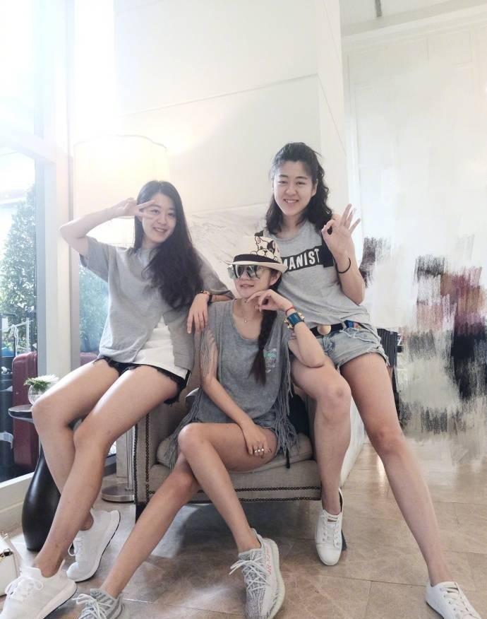 这个就是她们家三姐妹合照了,一样是穿着白色体恤,下面是短裤,然后是白色鞋子呢,小编觉得发型都很像,安以轩和另外一位戴着眼镜,所以还是可以区别吧,那摘掉眼镜会不会更加像呢?我们就来看看吧。