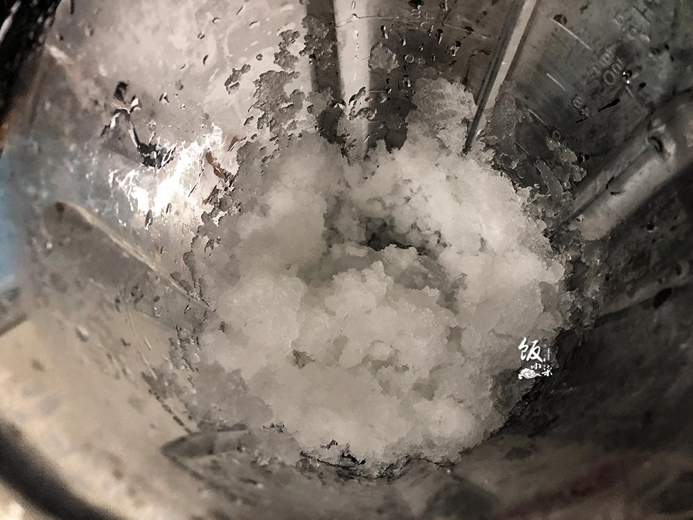 第二步,冰块放入刨冰机中,搅成碎块,然后装入杯子里。如果没有刨冰机,用料理机搅碎就可以。