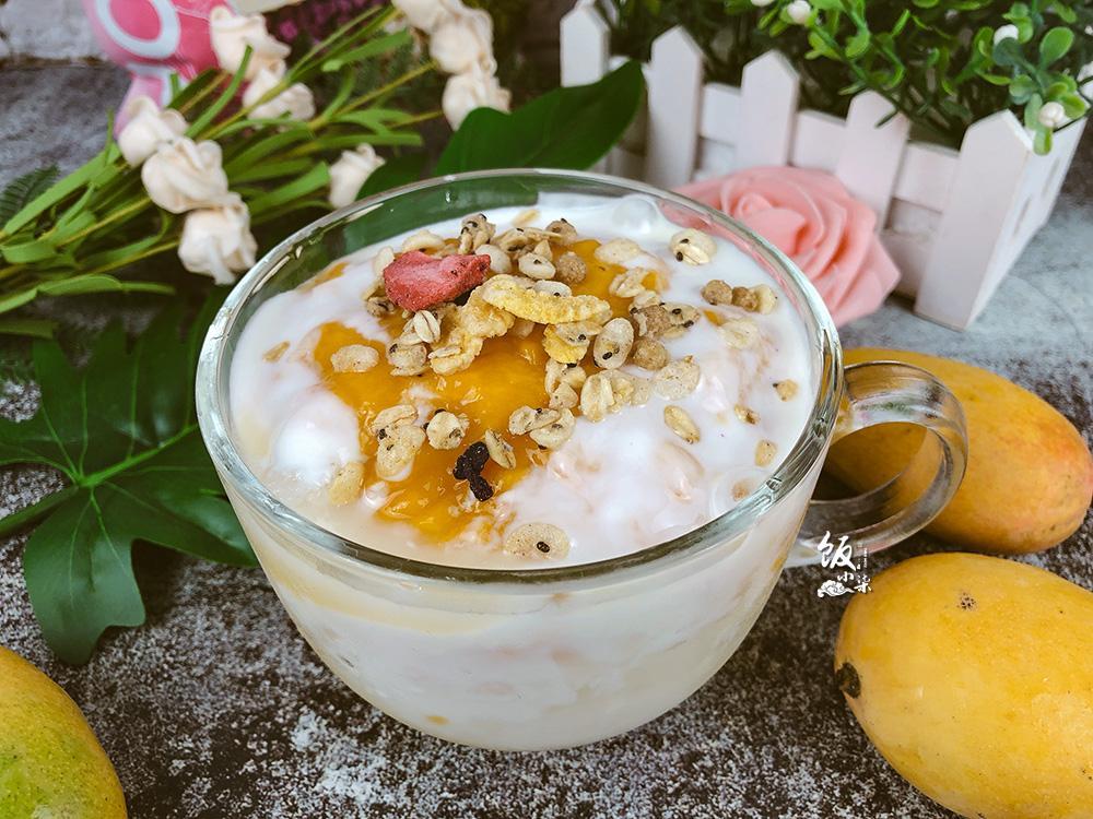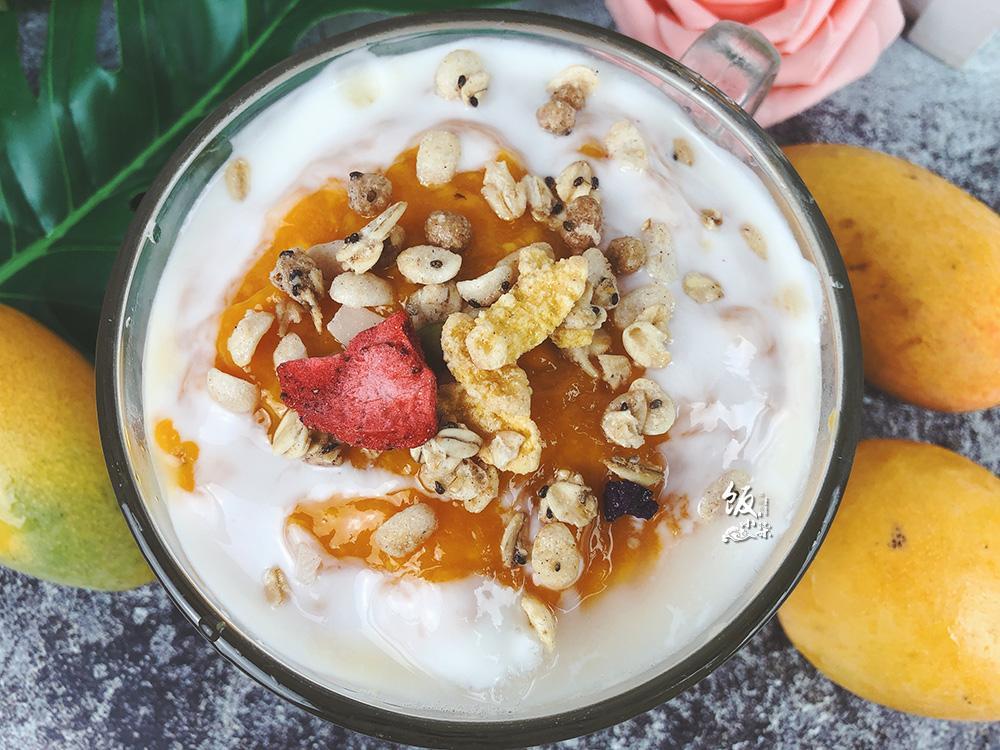 第三步,接着倒入冷藏好芒果汁,然后倒入适量酸奶,最后放一些干果和坚果,这样一份芒果刨冰就做好了。