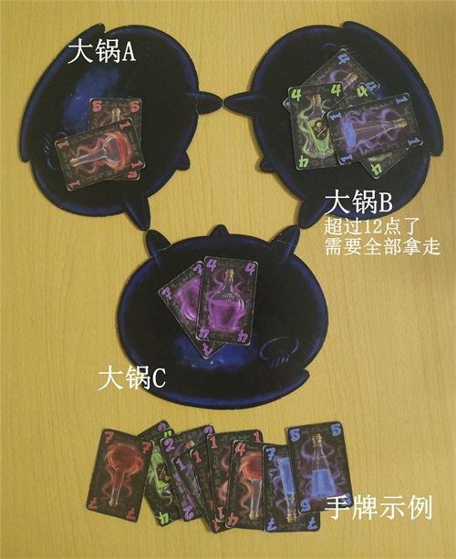 洗匀分牌,有多余的牌则按颜色放在对应大锅里,绿色随便放所有人轮流出牌,每次必须选一瓶药水放大锅若某人出牌后,这口锅里所有牌的点数加起来大于等于13,那么他必须收下这些牌,翻面放一边别让其他人看见当所有人出完自己的手牌时,这一局结束