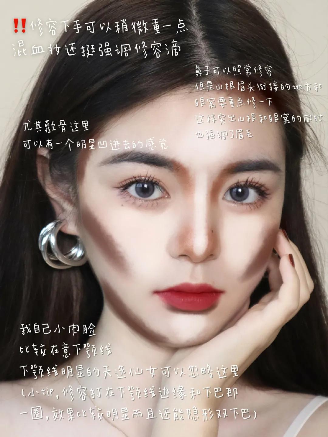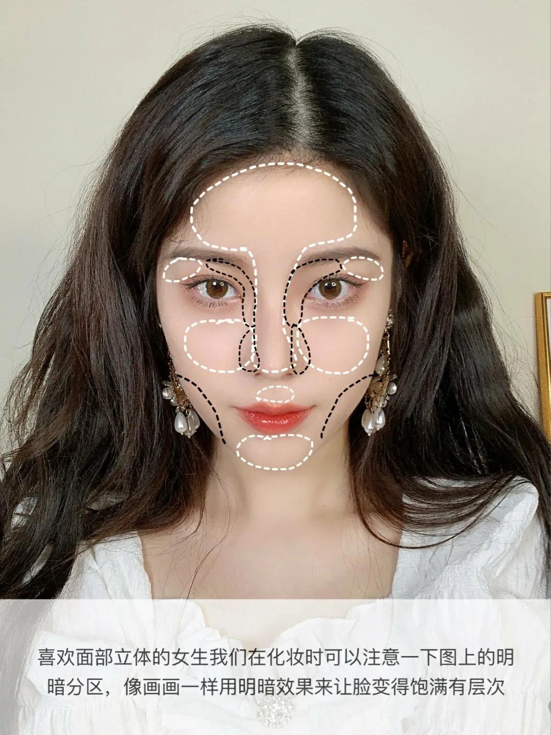 先用深色的修容粉给脸部轮廓修容,具体位置如下图。