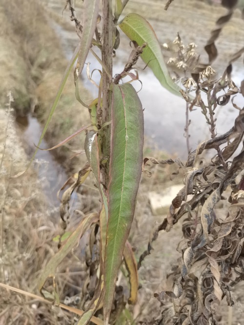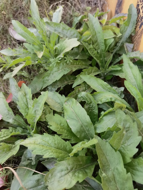 特别像是野菜,原来嫩茎叶可作蔬菜,有点像莴笋叶,不过从来没有吃过。翅果菊是菊科莴苣属植物,边缘有三角形锯齿,上面较嫩的叶子是绿色的,底下较老的叶子是紫红色的,耐寒,冬天也长得好,常生长在水沟边、河边、草地、田野处。