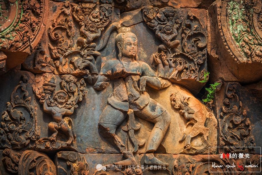 浮雕刀工流畅细腻,造型繁复圆润,线条纤巧柔美,色彩鲜艳妩媚,在所有吴哥浮雕中首屈一指,被誉为“吴哥艺术之钻”。其中的阿卜娑罗姿态优雅,与吴哥寺的阿卜娑罗浮雕齐名。