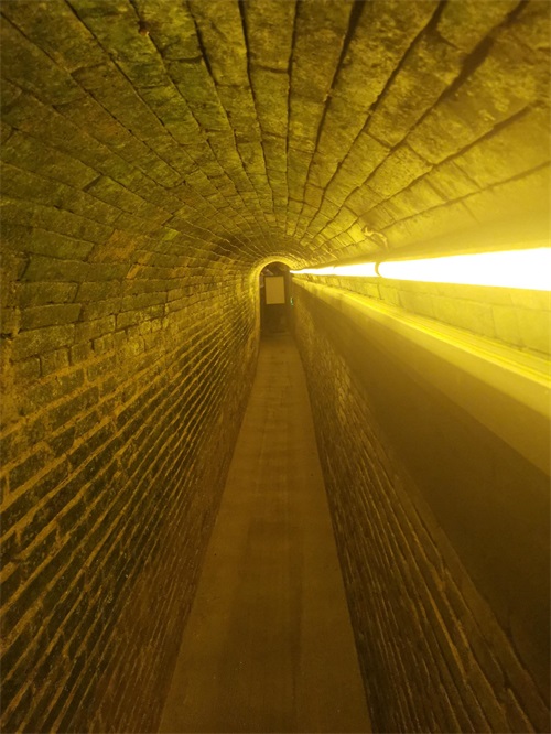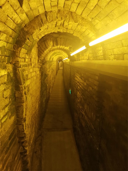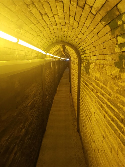 地道内,尽管有电灯照明,由于位于地下,不见天日,仍让人觉得光线阴暗,在这样一个封闭的空间里,只有地道墙壁上规则地分布着的通气洞,时刻地保持着地道与外界的空气交流。