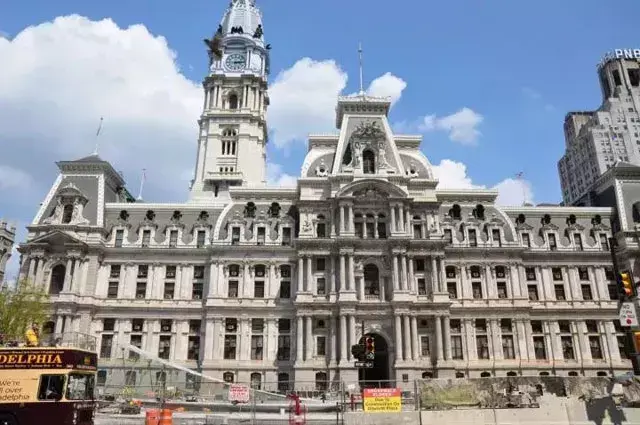 费城市政厅在费城是最引人注目建筑。大厅由着名建筑师John McArthur设计,始建于1871年,耗时30年,耗资两千四百万美金。市政厅位于市中心地带,整个建筑呈四方形,高167米,有将近700个房间。主体由花岗岩构成,顶部是费城之父William Penn的巨大铜像,他俯视着该城着名的Penn Treaty公园。建筑最引人注目的除了费城之父的巨大铜像外,建筑外部还有250多个浮雕也格外醒目。从远处看,整个市政厅就像一枚巨大无比的方形印章,铜像是印章的抓柄。