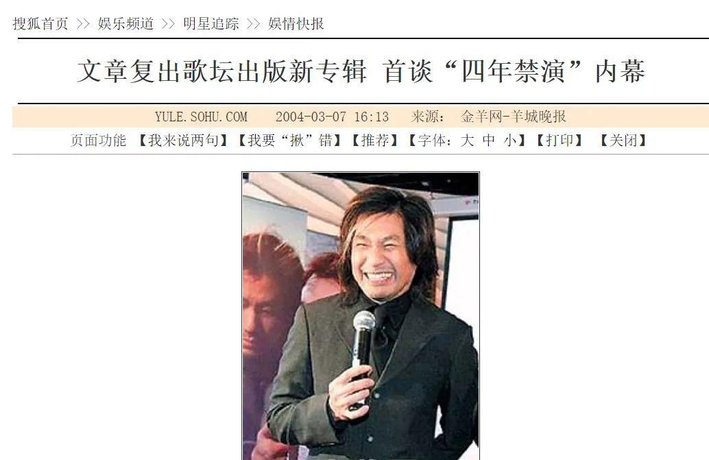 1994年,文章突然被台湾有关部门禁演了,往后4年,他一直不能演出也不能出唱片,演艺事业一落千丈。文章被禁的理由有些荒唐,说他没有台湾身份,没有获得演出许可。