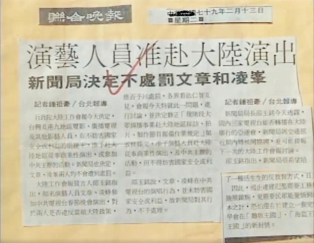 文章终于鼓起勇气,跟凌峰都登上了春晚。当时,台湾艺人到内地演出是要报备的,而且未经批准不准上央视,所以文章和凌峰都算违规了,新闻局已经要求两人就情况给出口头或者书面报告,当时很多媒体都报道了这件事,按规定,两人是要被禁演半年的。