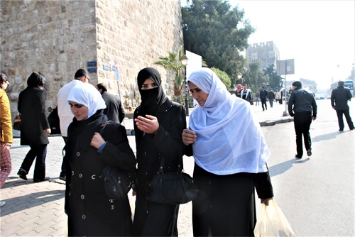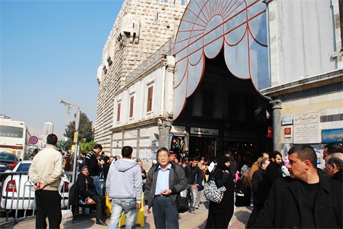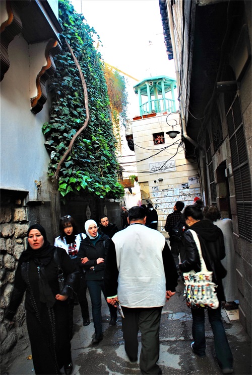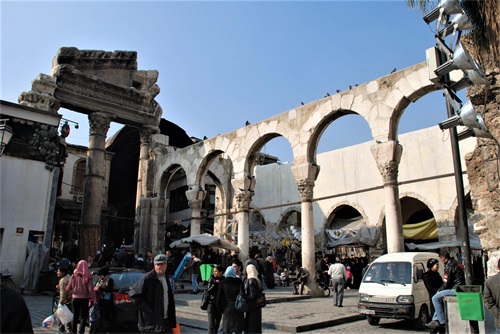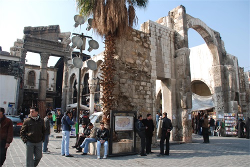 走在这条长500米的商铺集市,不太宽的通道上,几乎全是带头巾的阿拉伯人,身挨身、肩擦肩、头碰头,黑色布沙遮掩全身的阿拉伯妇女比比皆是。当走到集市的尽头,诸多罗马时期的残败断落的石柱挺立在露天地里,仿佛仍冒着战争烟云……