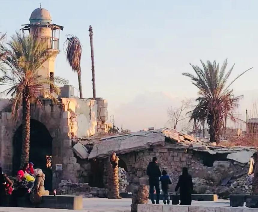 倭玛亚清真寺是伊斯兰世界的第四大清真寺,建筑风格独树一帜,门口正对哈米迪亚集市。然而,也没有逃脱战争的袭击。我步入倭玛亚清真寺,长方型庭院内,正面是主殿,三面廊柱。我踩着乱石碎片,双脚冰凉,我硬挺着脚寒用步子丈量寺的大小,结果算下来长200步、宽140步,总面积大约1.6万平方米。
