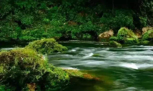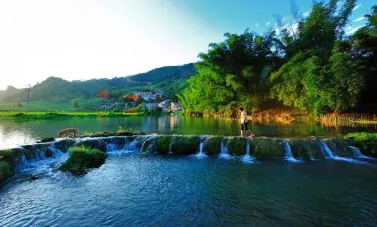 河边绿树青山、清风扑鼻。河水清澈见底,还有小螺小虾藏匿在石缝中,把手放入水中,就能够得着,山野乐趣十足。
