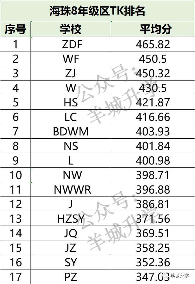 1是中大附,2是五中附属,3是珠江(六中珠江三校区21个班), 4是五中, 5是海实 ,6是绿翠, 7是北大为明 ,8是南实 ,9是六中(2个本部公办班), 10是南武, 11是南武文润, 12是江外, 13是海珠实验(原98中), 14是97中, 15是景中 ,16是41中, 17是琶执。