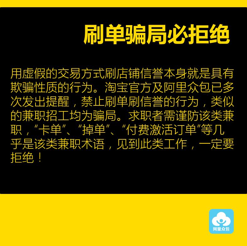 用虚假的交易方式刷店铺信誉本身就是具有欺骗性质的行为。淘宝官方及阿里众包已多次发出提醒,禁止刷单刷信誉的行为,类似的兼职招工均为骗局。求职者需谨防该类兼职,“卡单”、“掉单”、“付费激活订单”等几乎是该类兼职术语,见到此类工作,一定要拒绝!