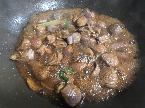 起锅烧油,放入羊肉翻炒片刻,加葱姜蒜煸香,然后烹入料酒和白酒,加点生抽和老抽翻炒上色。