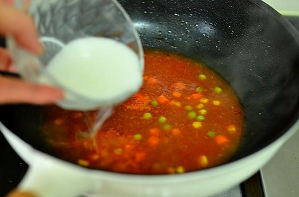 10、再加蔬菜粒大火煮开,倒入少许水淀粉勾芡,使汤汁更加粘稠。
