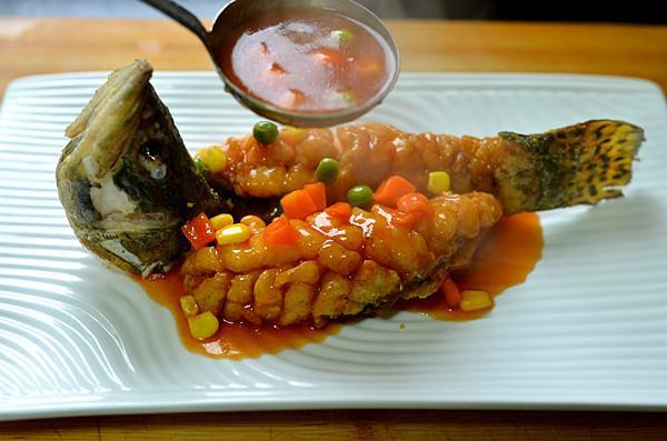 11、 煮好的汤汁趁热浇在摆好造型的鱼身上,这样一道好吃的松鼠桂鱼就做好了,小伙伴们学会了吗。