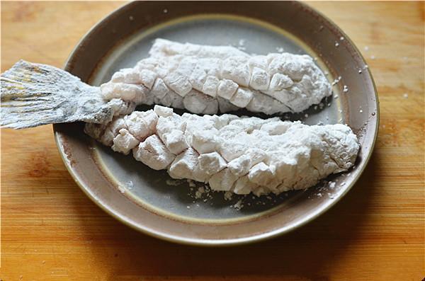 6、盘中倒适量生粉,将鱼身上均匀的裹上生粉,再将多余的生粉抖掉。
