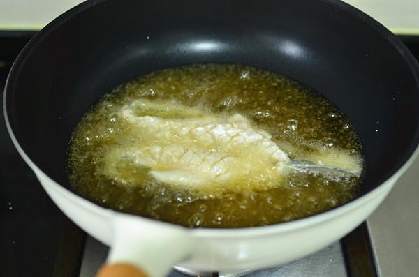 7、锅中倒入能淹住鱼的油,中大火烧至7成热将裹好生粉的鱼身放入锅中炸,炸至两面都金黄后捞出备用。