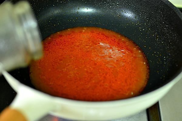 9、炒锅中加入少许底油,倒入番茄酱20克小火炒一下,再倒入半碗清水大火烧开,加入盐5克、白糖5克。
