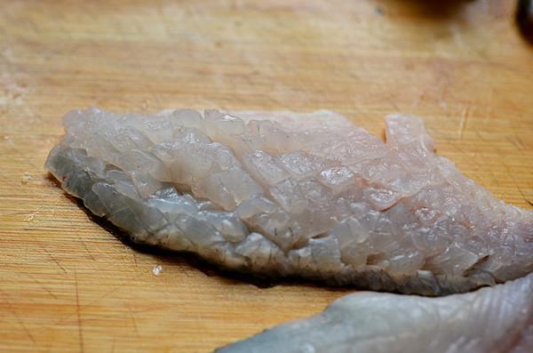 3、鱼皮朝下在鱼肉上等距离的斜切,不要切断鱼皮。