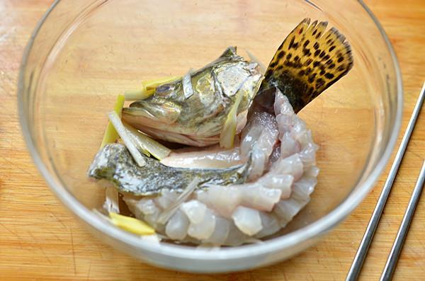 5、将鱼头和切好的鱼身,切下的鱼肉块放入大碗中加姜片10克、葱丝10克、料酒5毫升、盐5克、黑胡椒粉2克,搅拌均匀腌制10分钟。