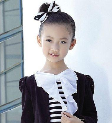 盘发步骤:无刘海小女孩花苞头盘发发型,是将小女孩乌黑长发直接向后梳理,在发旋靠右的位置扎成马尾辫,然后盘成常见的花苞头,用黑色相间的蝴蝶型发饰点缀着,展现的是小女孩甜美气质范儿。