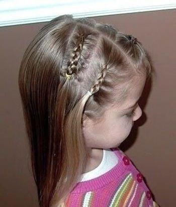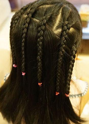 四年级小女孩的头发不算很长,中分无刘海的直发发型可以编织成这款小女孩中分侧蝎子辫半编发哟,头顶发丝中分梳理,右半边编织成两个蝎子辫,左半边编织成三个蝎子辫,其余发丝自然披散着,不对称的蝎子辫半编发简单又新颖。