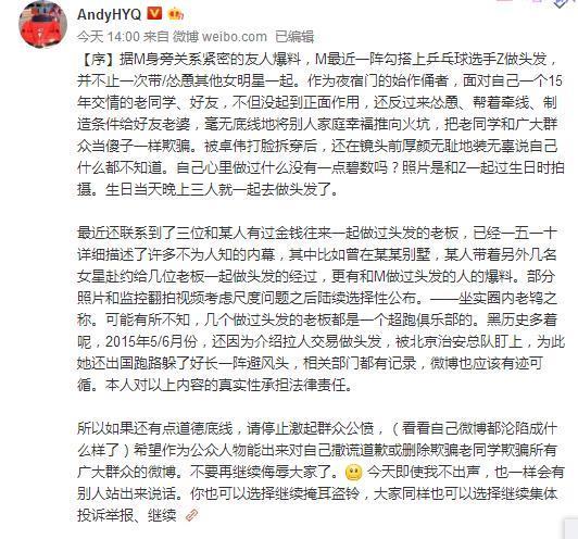 下午两点,非常准时,也没有让大家失望,爆料出了众多马苏的黑料,不仅如此,还牵扯到乒乓球大满贯得主张继科,作为一位体坛巨星,因为和马苏与另外一名女子一起“做头发”,导致自己的正面形象从此人设崩塌!