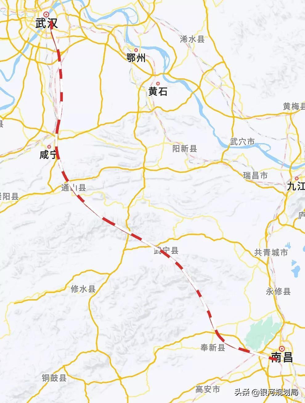 武汉至南昌高铁路线走向,过咸宁、通山、武宁、靖安、奉新等地
