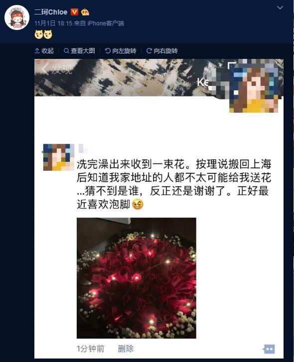 就在昨日,周二珂在微博中大方晒出一张玫瑰花的图片,还配文感慨:不知道是谁送的。看得出二珂对这份礼物似是相当满意,还表示正好可以泡个花瓣脚。