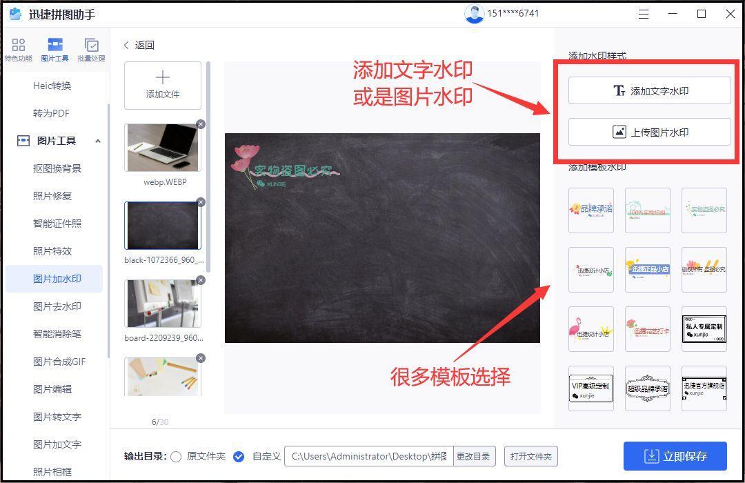 这是一个专业的图片编辑软件,里面可以给图片进行多项编辑,其中就有给图片加水印或者是去水印的功能。使用它来添加照片水印,我们只需要在页面左边点击“图片加水印”,支持批量添加水印,所以可以将需要加水印的图片全部添加进来。我们可以在右上角选择文字水印或者是图片水印,也有很多水印模板供大家选择,是不是非常方便呢?
