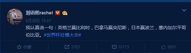 6月28日,刘语熙继续“毒奶”:“我认真说一句:英格兰赢比利时,巴拿马赢突尼斯,日本赢波兰,塞内加尔平哥伦比亚。”