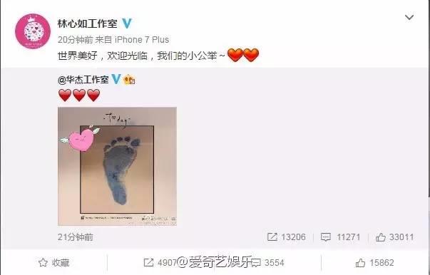 1月6日晚,林心如在社交网上写道“欢迎我们的小公主”,贴上一张女娃脚丫照,宣布诞下女儿。
