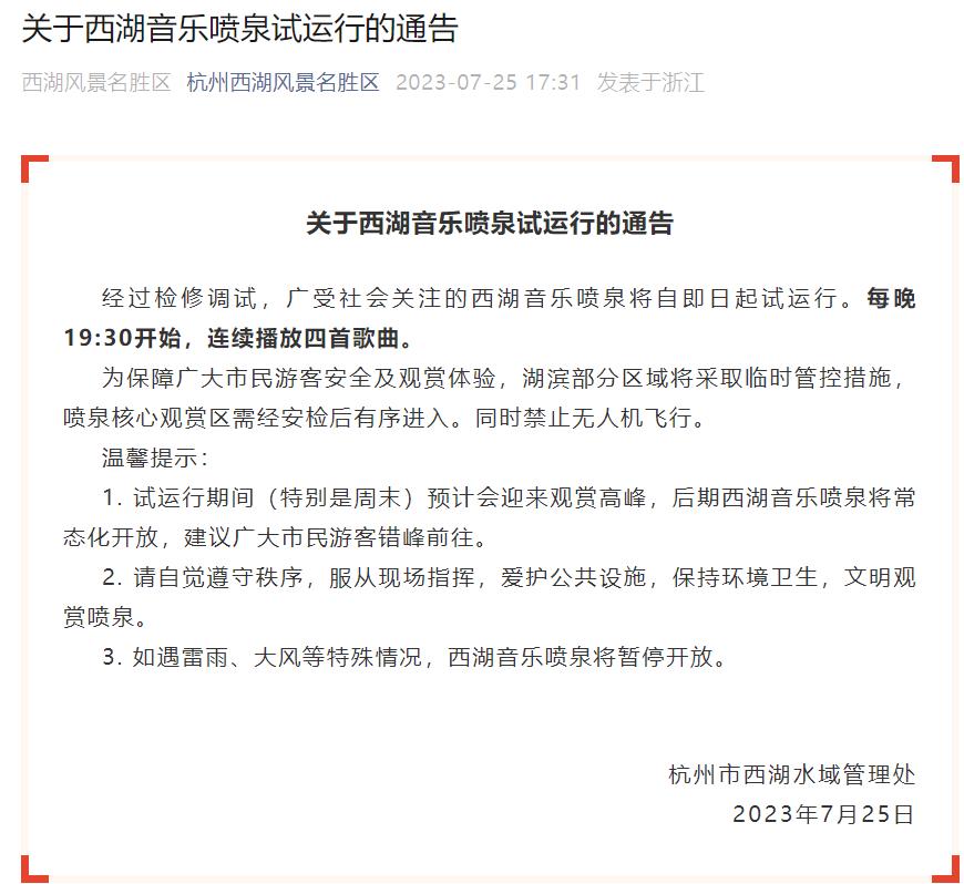 杭州西湖景区:西湖音乐喷泉将自7月25日起试运行,每晚19:30开始,连放四首歌曲