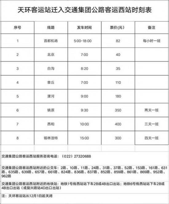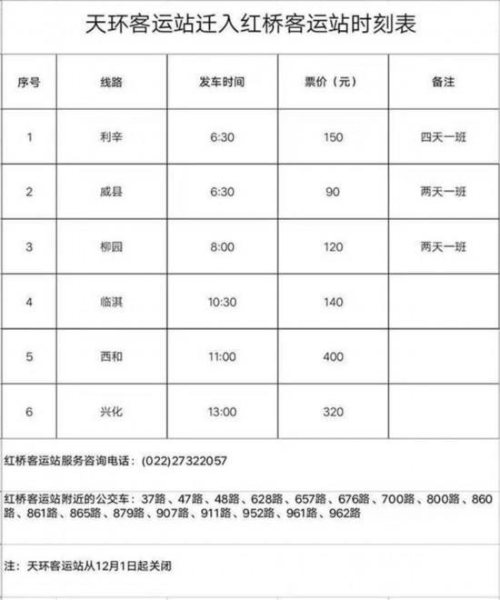 为全面提升天津市长途客运车站整体运营能力和服务水平,天津市长客运业有限公司按照交通“十三五”规划,结合所属客运站整合及优化线路运营战略,经上级主管部门批准,2018年11月30日天环客运站正式关闭停用。自2018年12月1日起,原天环客运站发班的线路、班次、车辆全部迁入天津西站长途汽车站及红桥长途客运站,原发车班次、时间、票价不变。具体情况如下:(附表)
