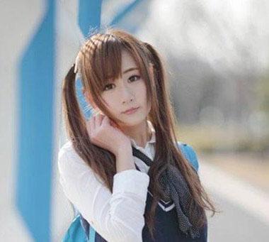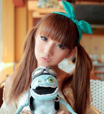 这款双马尾扎发是不是也很甜美可爱呢?将顺直的长发染成亮丽活泼的橘棕色,然后扎成两个串高马尾,与整齐的刘海,青蓝的蝴蝶结发箍相配更显甜美姿态。