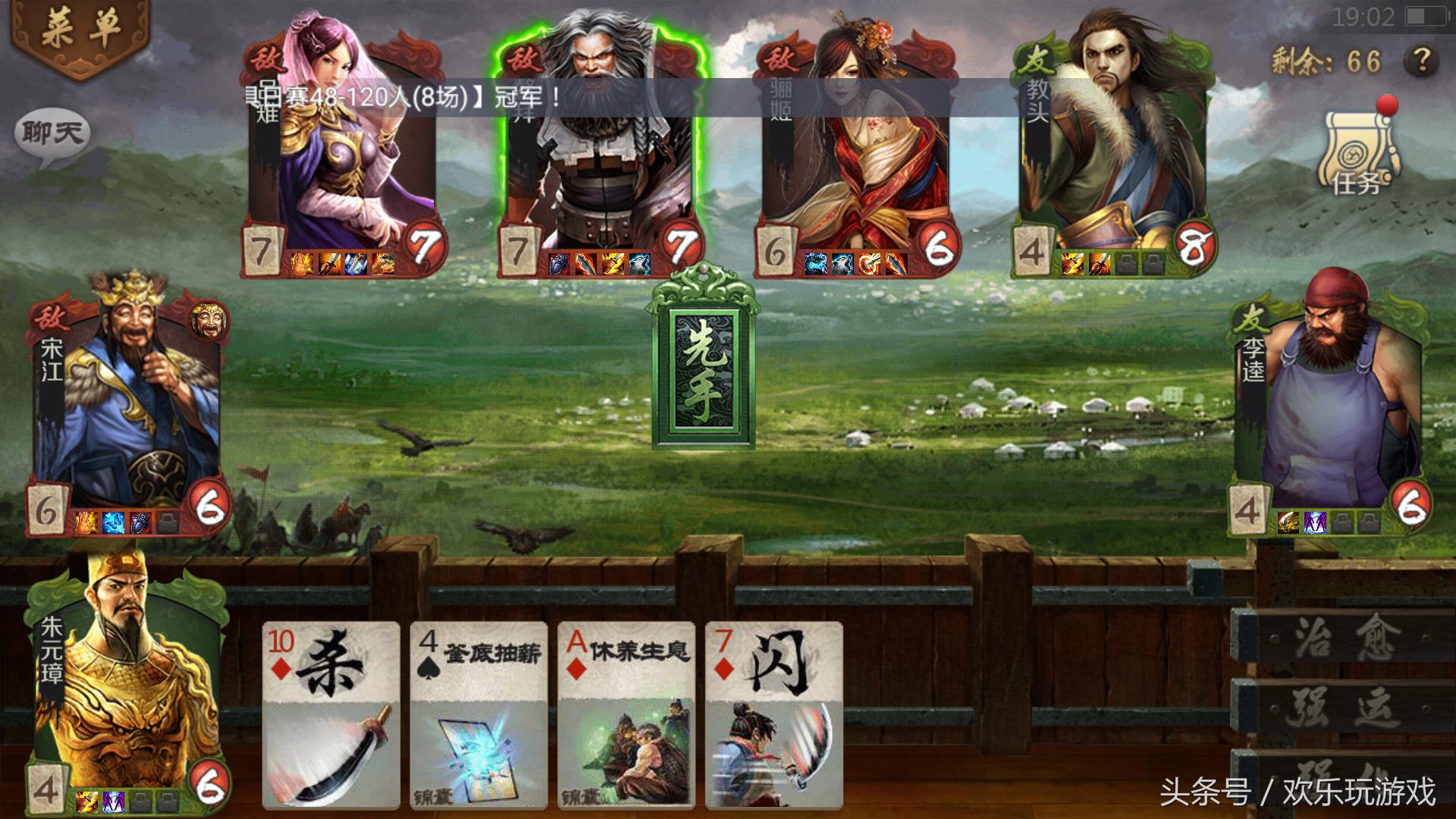 1,这一关难度不是很大,杀手都没在玩家位置,虽然不能用卡牌游戏组合“僵尸”组合,但是能用“搞基”组合,只要卡牌英雄“丽姬”和“鳌拜”没有武器,电脑基本是杀不到游戏玩家的英雄。