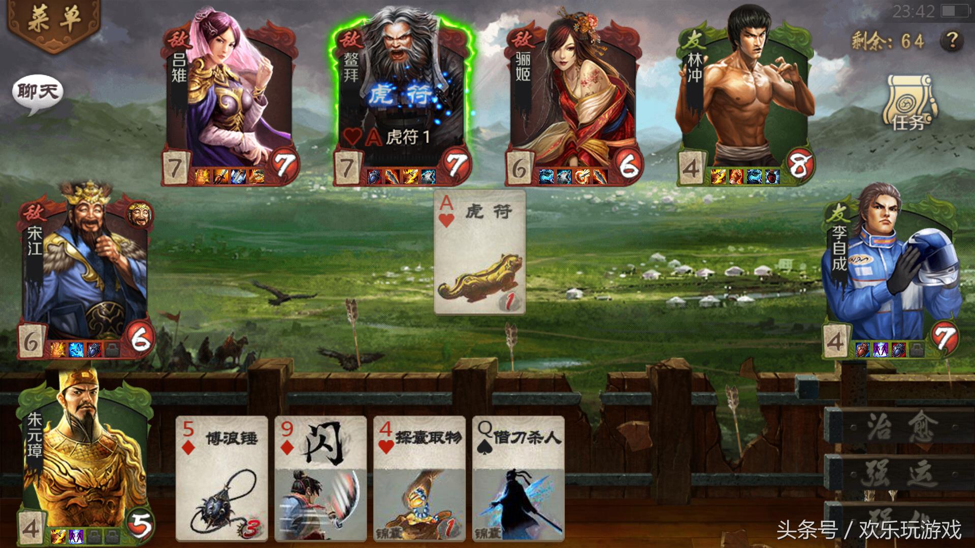 这一关只有一个卡牌英雄带“法家”技能,可以打手拿卡牌“虎符”,可以迅速结束战斗。