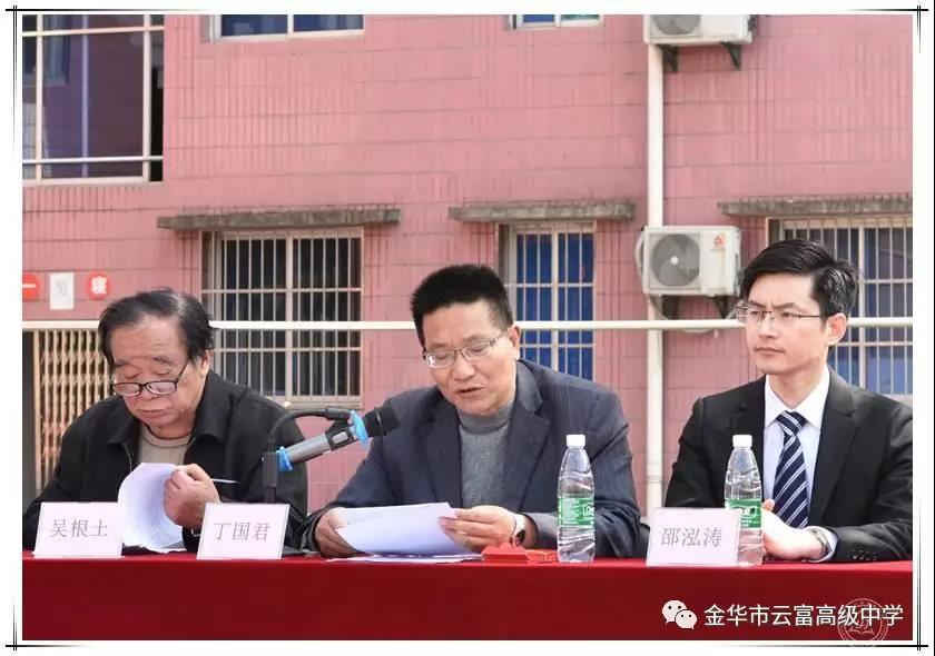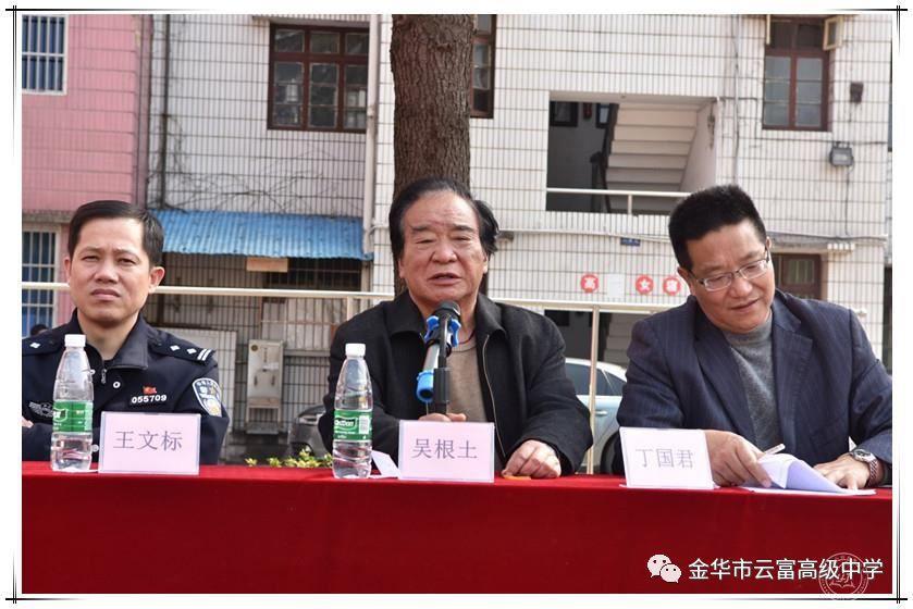 开学典礼上在主席台就座的有,浙江省特级教师、金华市名校长吴根土校长,金华一中帮扶项目负责人丁国君校长,金华西关派出所教导员、金华云富高中法制副校长王文标同志,金华云富高中法律顾问邵泓涛律师,金华云富高中首届家委主任李奇同志,学校各科室负责人。
