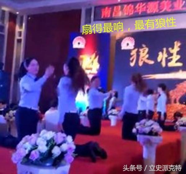 这是南昌某美容院招商的现场,十几位身材姣好,面容清秀的员工在红色的地毯上,不是接受奖励,也不是走进幸福的殿堂。而是老板为了体现公司的“狼性”命令员工跪在红色的地毯上互相狠狠的抽对方耳光。现场是一片“啪啪啪”的声音,全部女孩子的脸都被打得红肿了,也不敢停下手,看到观众都心惊肉跳。老板却说:“扇得越想,越能体现你们的狼性。“