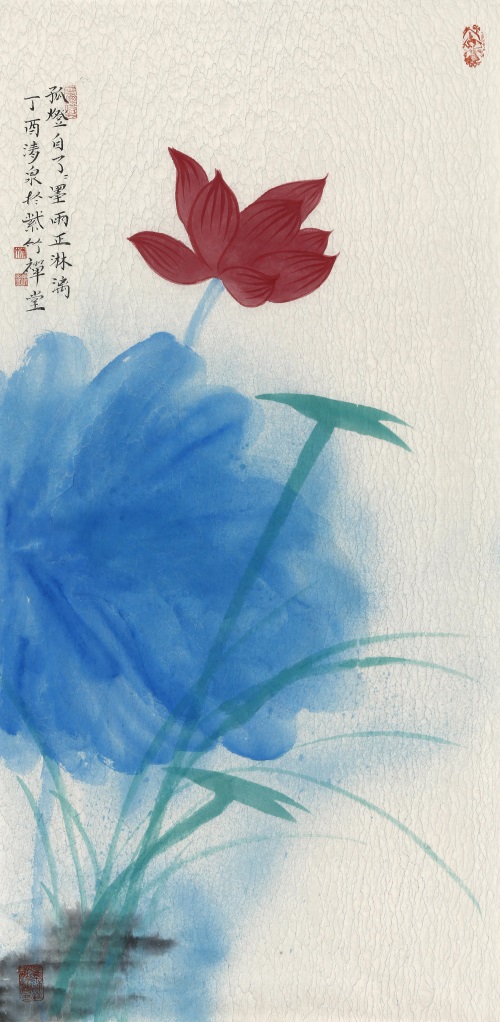 3、荷梗的画法:用墨色画花梗和叶梗时,要做到花重、叶重,梗也随之而重;花淡、叶淡,梗也随之而淡。梗的变叉应避免出现垂直线和平行线,相交角度也不要过大,要有长短、粗细、浓淡、枯湿的变化。