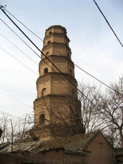 5、北塔。位于兴平市东城街道办事处北寺巷。原为清梵寺内建筑,塔建于唐贞观元年(公元627年),塔随寺名,初称清梵寺塔。梵清寺宋代改称保宁寺,塔亦遂称保宁寺塔。寺、塔历经唐、宋、明、清各代多次修葺。塔为砖结构,平面八角形,七层,残高38.6米,楼阁式。塔身每层南、北面辟券门或假券门,真假逐层上下相间。