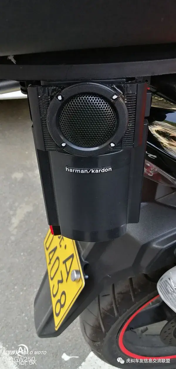加装漫步者低音单元,低音炮里拆出来的,低音喇叭和管柱,喇叭放中间,管柱敢右下角,不影响放全盔。