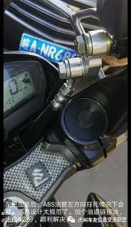 车把升高后,液压刹车油管方向打就会拉紧,要加装个油道延长连接块。