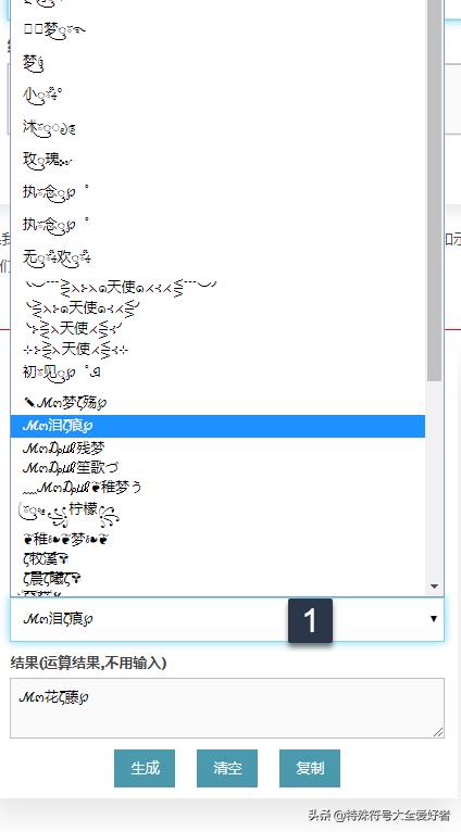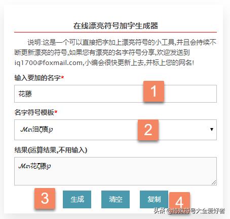 1-2:从操作界面我们可以看到,我们以"花藤"网名为例,想要生成:ζั͡花ั͡ζั͡藤ั͡ζั͡✾,只要按上面的输入就可以了,非常简单.同时第2步那里有很多符号供我们选择,我们也可以选择更多类型的符号,效果如下