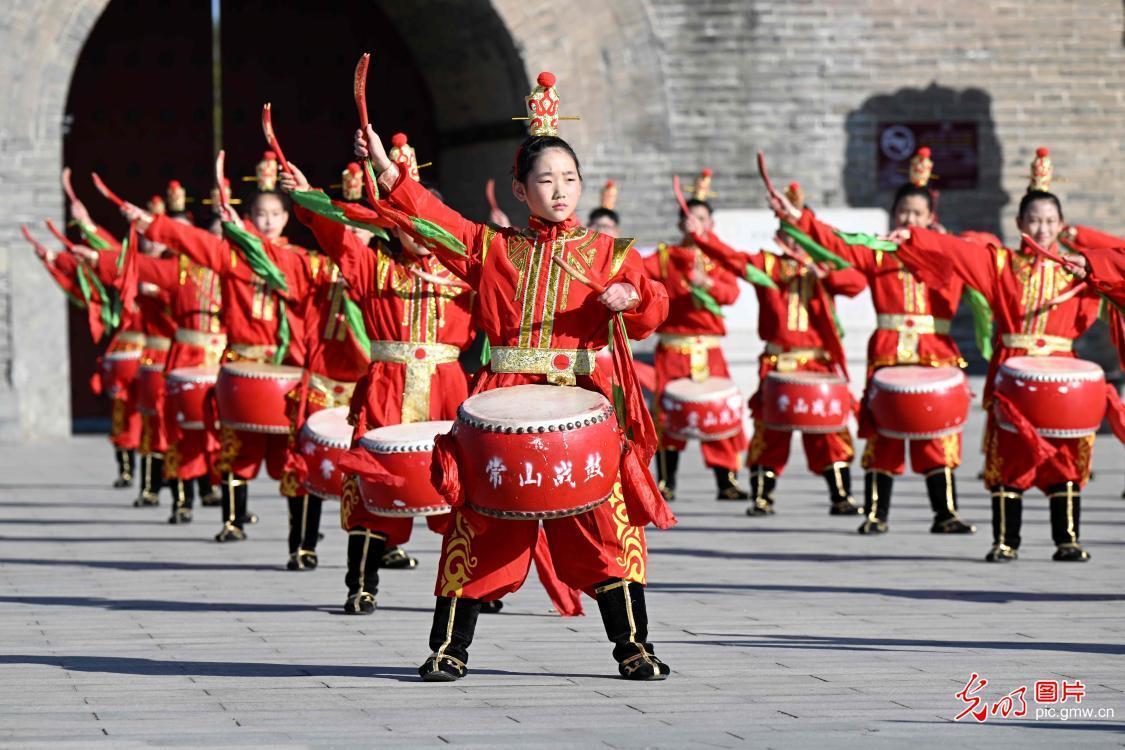2023年11月16日,河北省正定县南牛镇东杨庄小学师生在正定古城表演常山战鼓。