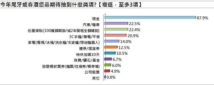 至于上班族最期待的尾牙及春酒大奖,由最实际的“现金”( 87.9% )夺冠,其次是“汽车/机车”( 22.5% )、“住屋津贴( 100 万头期款/或2年房租全额补助)”( 22.4% )。反之,超过半数上班族最不想抽到“自家公司产品”( 54.2% )、“过时 3C (电子相框/录音笔等)”( 44.3% )及“即期票券”( 33.7% )。