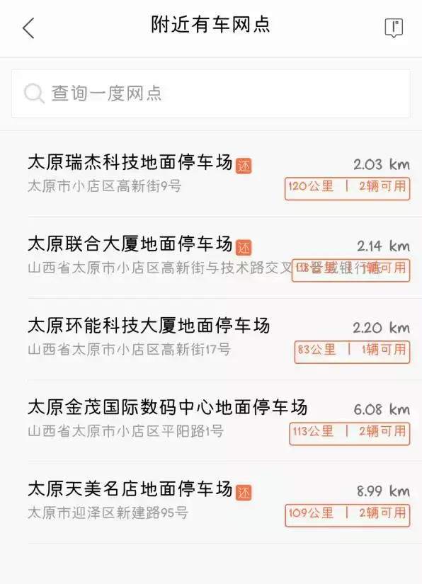还会给出取车网点的剩余车辆数目(比如0辆、3辆)、车辆的当前可续航里程、以及计费标准。