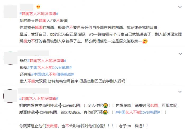 对此限制韩国艺人发微博的禁令,网友评论持两极化,掀起了棒粉与内娱粉的开骂。韩娱指的是韩国娱乐圈,而内娱粉即代表中国内地娱乐圈的粉丝。内娱粉对这禁令的立场是为韩国艺人打抱不平而辱骂中国的都是不爱国,竟然为了韩国艺人而“跳脚骂祖国”。有网友还表示追星之前应该看国际局势,更说出:“禁韩就是为了小小的娱乐圈吗,眼界真低”。有人还指责棒粉追星追得没立场,还说道:“加强限韩令不是理所应当吗”。