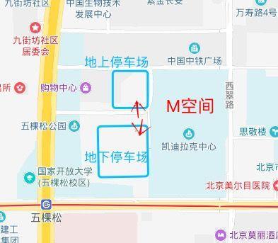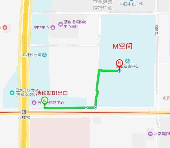 地铁:地铁1号线五棵松站,出 B1 口,沿下图指引步行850米(约15分钟)到达M空间入口处。