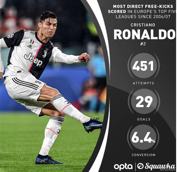 这13年间,C罗主罚了451次任意球,一共打进29球,进球率6.4%,而C罗的进球数也排名足坛第二,不过他的效率比起梅西稍有不如。不过,虽然他不如梅西,但是也是足坛第二,或许这也从另外一个侧面说明,梅西和C罗确实是足坛最好的两名球员。
